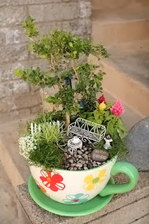 A xícara abriga o bonsai e também uma mini área de lazer no jardim. Como não achar isso um encanto?!